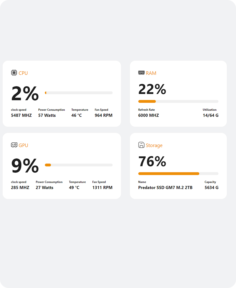 Monitor every critical metric, load, temperature, frequency and more in real time. Intuitive insights keep you effortlessly in control, with performance feedback at a glance.