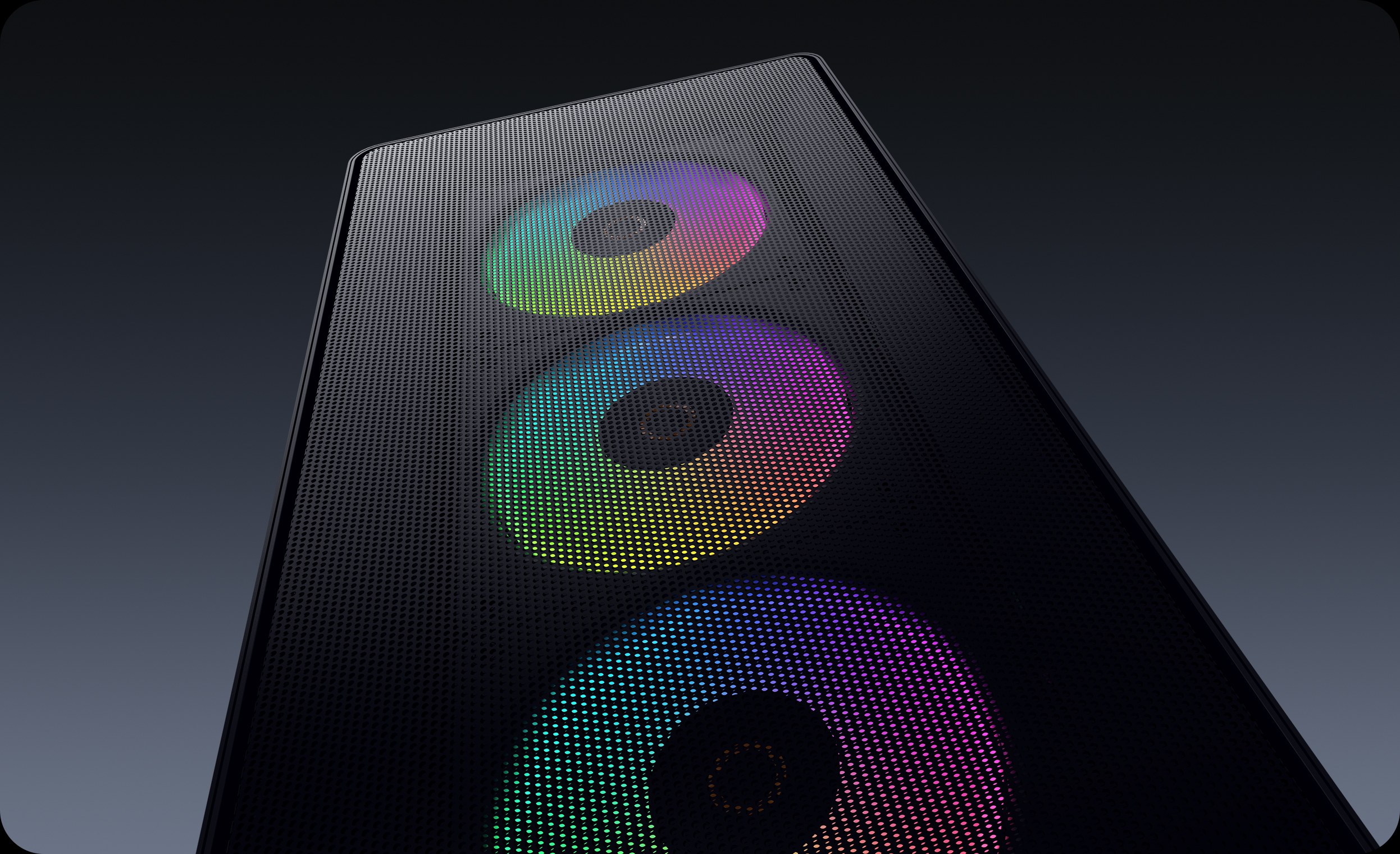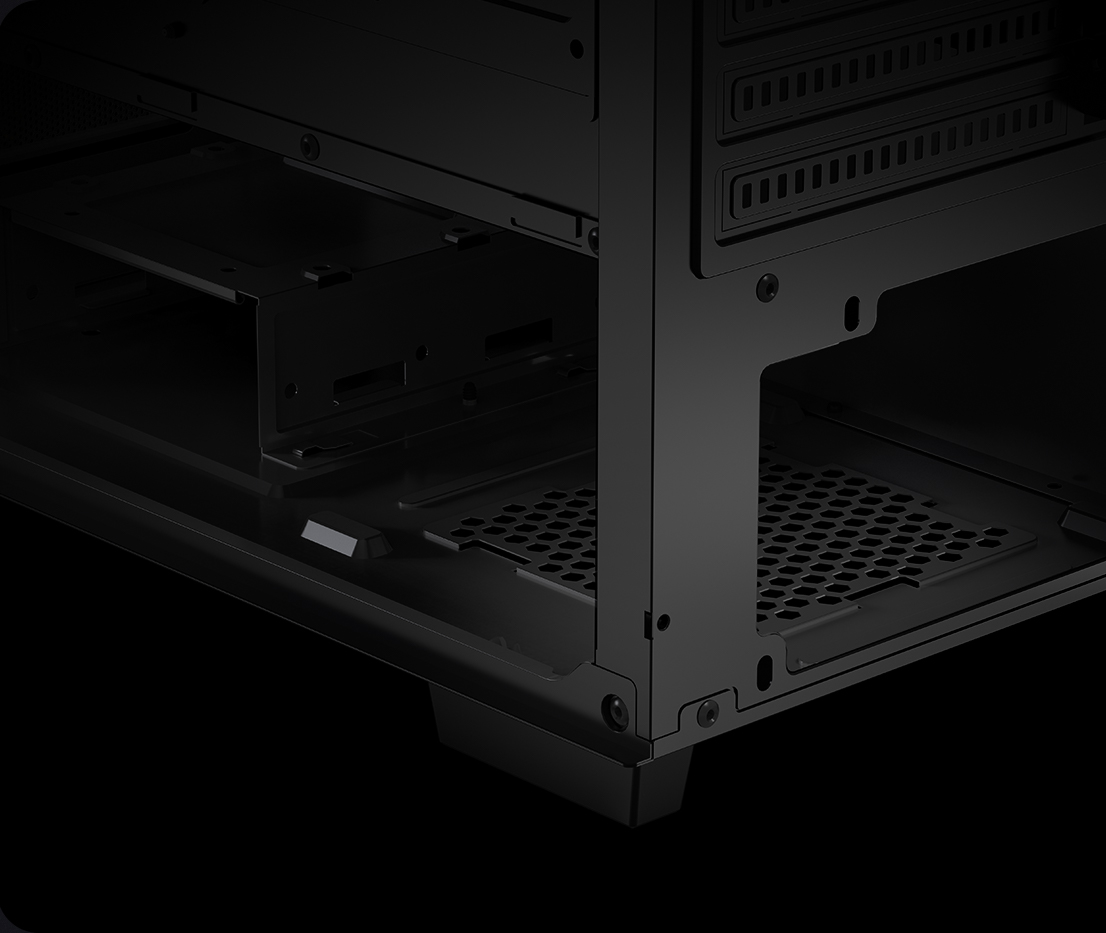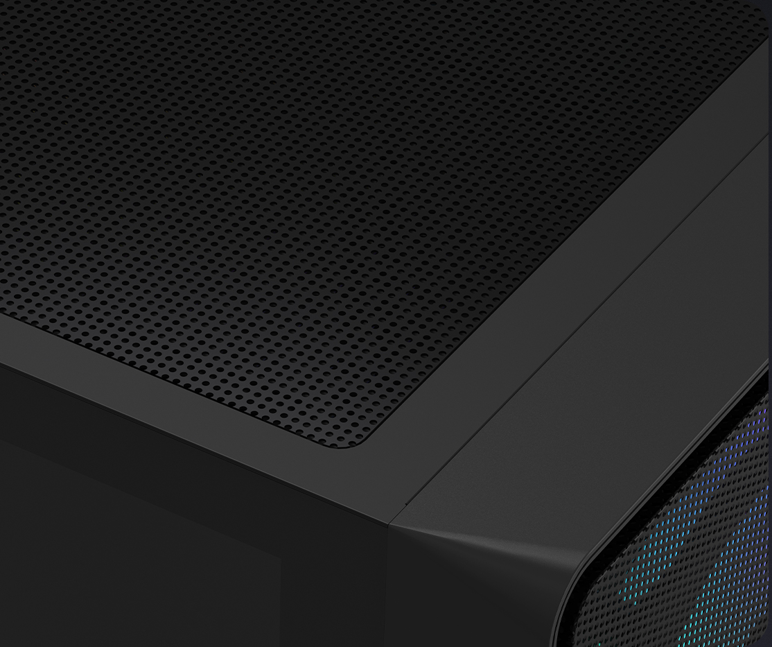 Continuing the signature circular matrix elements, the front panel is crafted from high-strength steel with the fine mesh, wrapped in a metallic finish for floating visual effect. Staying true to minimalist design, ensuring clean, sharp lines while balancing cooling efficiency, seamlessly merging aesthetics with performance.