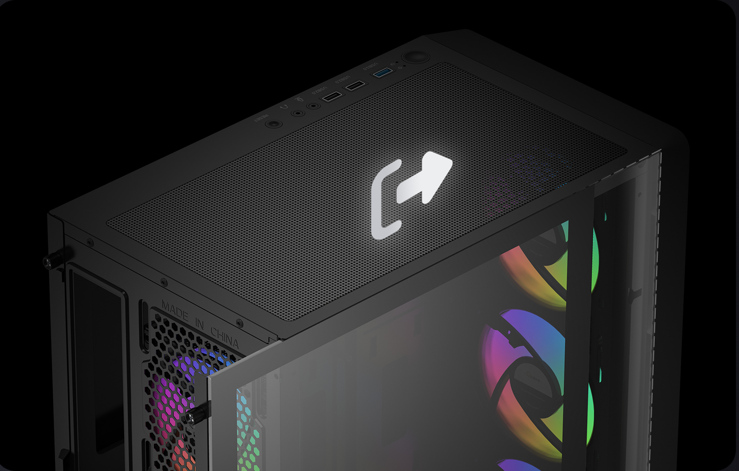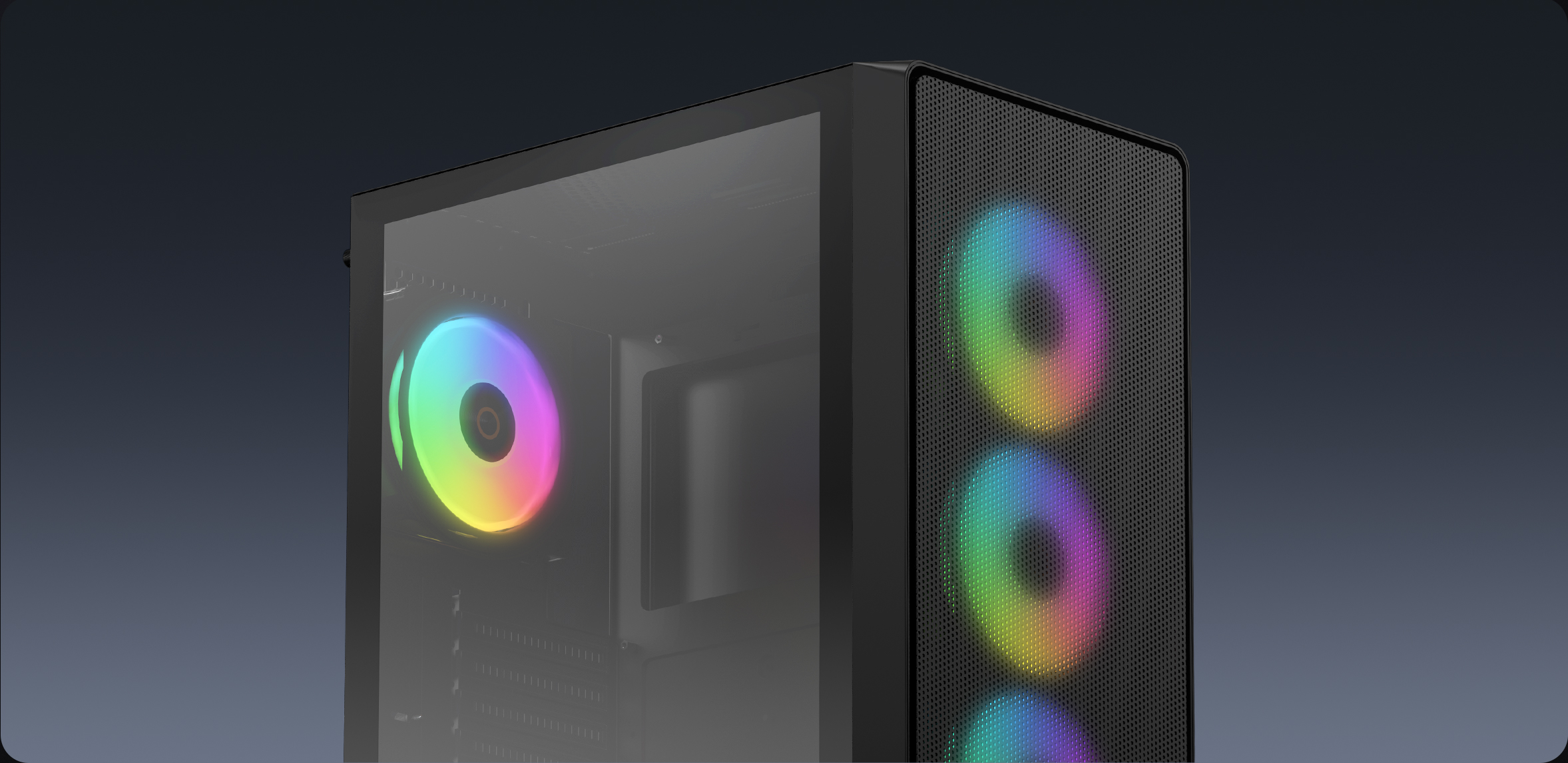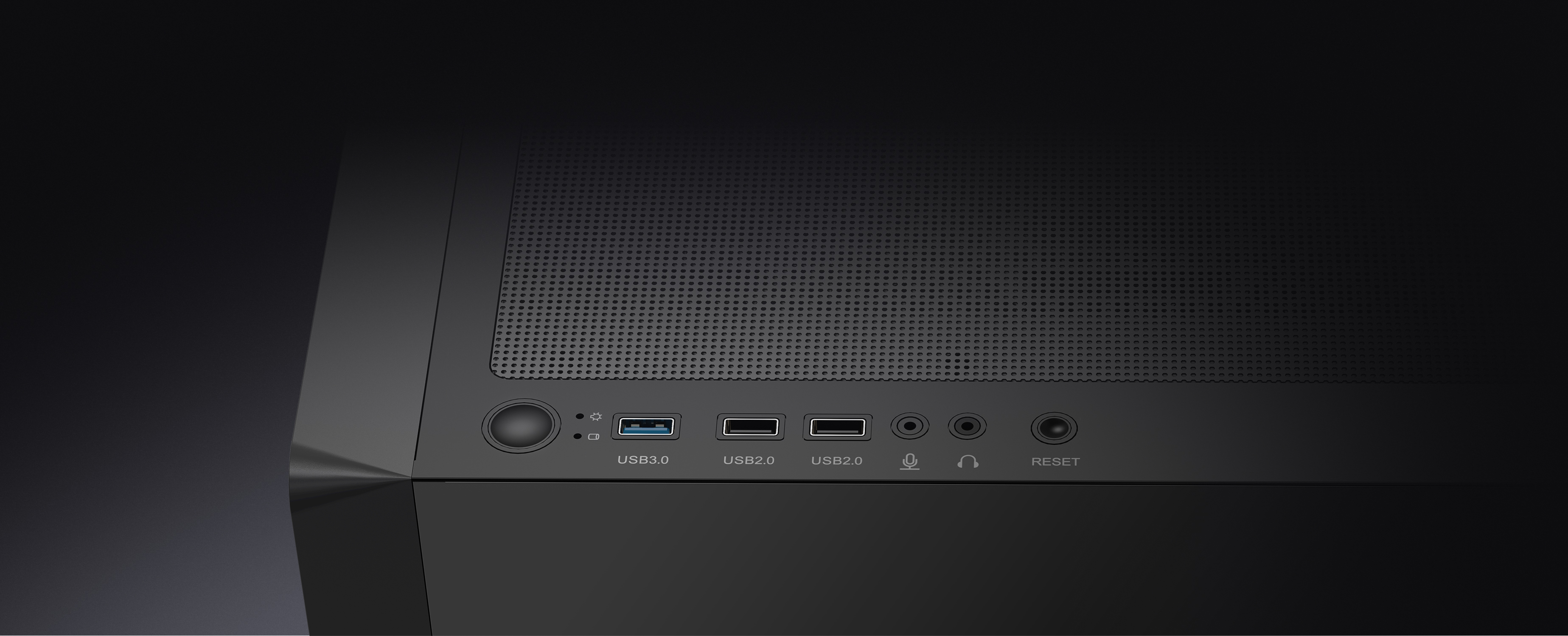 Continuing the signature circular matrix elements, the front panel is crafted from high-strength steel with the fine mesh, wrapped in a metallic finish for floating visual effect. Staying true to minimalist design, ensuring clean, sharp lines while balancing cooling efficiency, seamlessly merging aesthetics with performance.